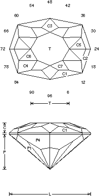 Addition # 5 - Notice the P1 tier only meets the girdle at 96-24-48-72. The C5 tier is made to adjust the L/W if you are off a bit. This is a little tricky for a new cutter. Getting all the crown meets correct is not easy. This can be cut in R.I. 1.54 to 1.76 (89%) with no changes.