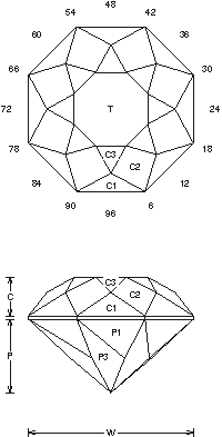 Details and information on Faceting Designs. A Faceting Design Diagram by Jeff R. Graham that presents various cuts and facets suitable for different gems.