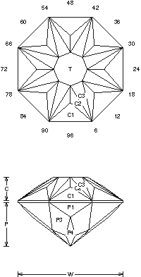 Detailed information and guide on Faceting Designs. A Faceting Design Diagram by Jeff R. Graham that presents various cuts, this one is called "3+ Pavilion"