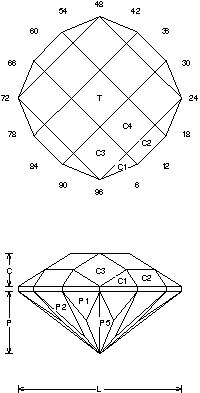 Detailed information and guide on Faceting Designs. A Faceting Design Diagram by Jeff R. Graham that presents various cuts, this one is called "Almost".