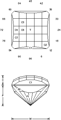 Detailed information and guide on Faceting Designs.Faceting Design Diagram by Jeff R. Graham that presents various cuts, this one is called "Baron's Choice"
