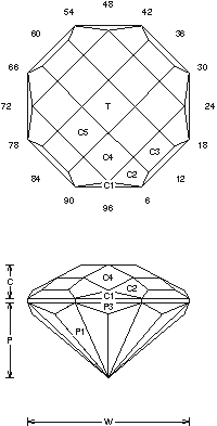 Detailed information and guide on Faceting Designs. A Faceting Design Diagram by Jeff R. Graham that presents various cuts, this one is called "Baseball".
