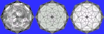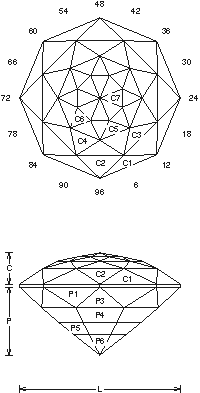 Gram Book 1 - This design cuts easier than it looks. The step cuts have to be close to the diagram for the design to work. As you can see, they are pretty easy to judge because the P3 facets line them up, 2-8cts almost any material. A table can be cut to leave C7 a step on larger stones or do not cut C7 on a smaller stone and cut to meet C6. Cut in refractive indexes 1.73 to 2.14 (91.4%) with no changes.