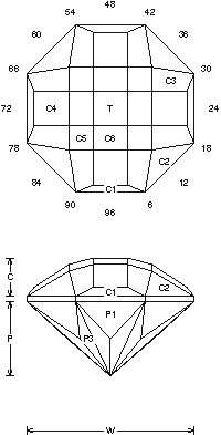 Detailed information and guide on Faceting Designs. Faceting Design Diagram by Jeff R. Graham that presents various cuts, this one is called "Brass Button".
