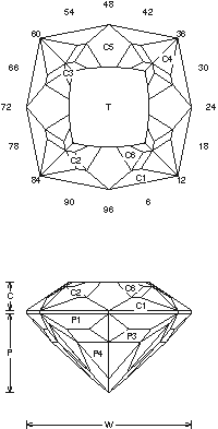 Addition # 2 - This design can be hard to cut, you may have to cut the steps a couple of times to get them right. The spacing is critical, however, the rest of the cut is not very hard, 2-24cts. Cut in refractive indexes 1.54 to 2.14 (80.1%) with no changes.