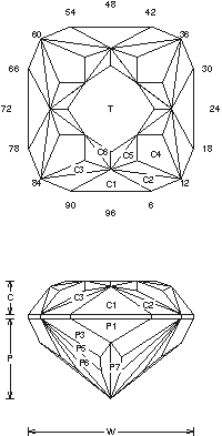 Addition # 1 - This design has very deep breaks. In order not to waste material cut a preform, see heading for measurements. The depth of this design helps light material and gives the stone a nice shape, 1-18cts. Cut in refractive indexes 1.62 to 1.93 (86.8%) with no changes. Works well in Topaz also…