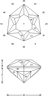 Detailed information and guide on Faceting Designs. A Faceting Design Diagram by Jeff R. Graham that presents various cuts, this one is called Crystal Star.
