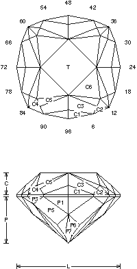 Successful tips and guide on Faceting Designs. Faceting Design Diagram by Jeff R. Graham that presents various cuts, this one is called Cushion Triple Star.
