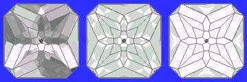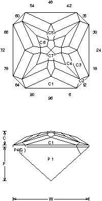 Addition # 9 - Note: The P3(G)girdle is variable, cut them to look like the diagram, or to fit your rough. Cut in refractive indexes 1.54 to 2.14 with no changes. This is quite pretty and works great in Garnet, I prefer medium saturation. I like this in medium saturated Amethyst and Citrine. Try some sets, they will sell fast. On a large stone a table can be cut to meet C6.