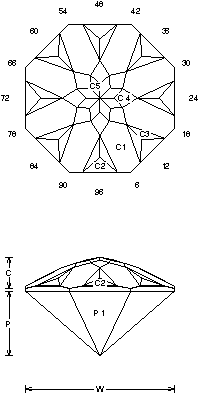 Addition # 9 - This is designed to be cut in a large stone. On a small stone the C5 can be omitted, also a table can be added on very large stones. Note: Cut C1 to about the normal girdle thickness, do not make the point too sharp because it will chip. This is very quick and fairly easy cut, but depending on how you cut the C1 there may be some adjusting needed. Cut in refractive indexes 1.54 to 2.14 with no changes. Hint: Line the crown up using the C2, before cutting the C1 in.