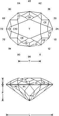 Detailed information and guide on Faceting Designs. A Faceting Design Diagram by Jeff R. Graham that presents various cuts, this one is called "Edge Oval".