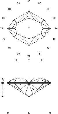 Detailed information and guide on Faceting Designs. A Faceting Design Diagram by Jeff R. Graham that presents various cuts, this one is called "Flat Eye".