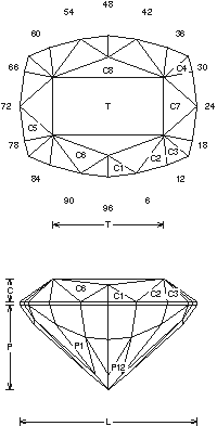 Addition # 5 - NOTE:P1 and all of the girdle facets will meet EXCEPT at the corners. This is not all that easy to cut, be sure your L/W is correct. This is 75.7% in Quartz, and works well in Zircon (88.1%).