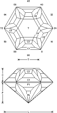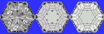 Successful tips and guide on Faceting Designs. A Faceting Design Diagram by Jeff R. Graham that presents various cuts, this design is called "Frill Hex".
