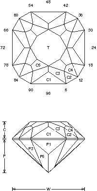Addition # 1 - This design is a little harder to cut than it looks, so watch the meets. It has nice flash and is not that hard to cut (for a modified square). Cut in refractive indexes 1.54 to 1.93 (85%) with no changes. It makes a nice stone in light to medium material, 1-6cts.