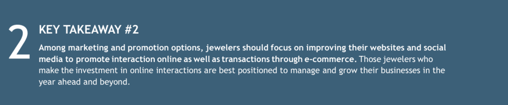 More than half of respondents reported an increase in online store traffic this year, yet 30% of stores in the survey indicated they made no changes in their marketing mix. Those who did make changes posted more on social media platforms like Facebook, Instagram, Twitter, etc. (58%), followed by showing inventory on websites (30%) and offering e-commerce purchasing of jewelry online (25%).