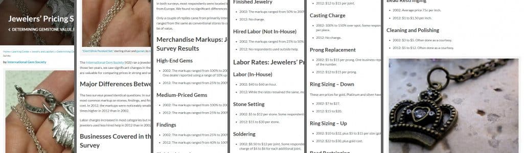 The two surveys posed identical questions. In our initial jewelers pricing survey, we found the most common markup on stones, findings, and finished jewelry was 200%, three times the cost. In 2012, the markups were noticeably smaller. However, gold prices were about four times higher in 2012 than in 2002.