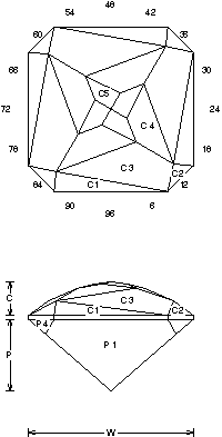 Addition # 9 - Cut in refractive indexes 1.54 to 2.14 with no changes. This is interesting and works well in about any material. It works well in Garnet and Sapphire. Note: The corners are just cut in and can vary, make them as close to the diagram as you can. A table can be cut to meet C5 on a large stone.