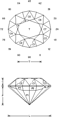 Addition # 5 - This is a very low L/W oval and is designed to be cut in small material, but works well in any size. I often need a design like this for a quick oval in nodule shaped Tourmaline. This works in R.I. 1.62 to 1.93 (91.5%) with no changes.