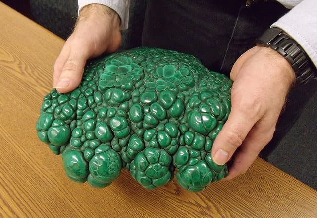 Although working with malachites can pose health risks, wearing finished jewelry pieces or displaying carved objects or natural specimens should be safe.