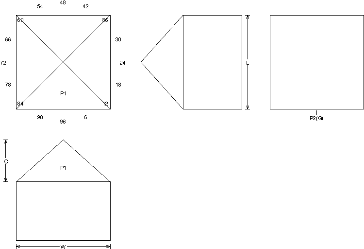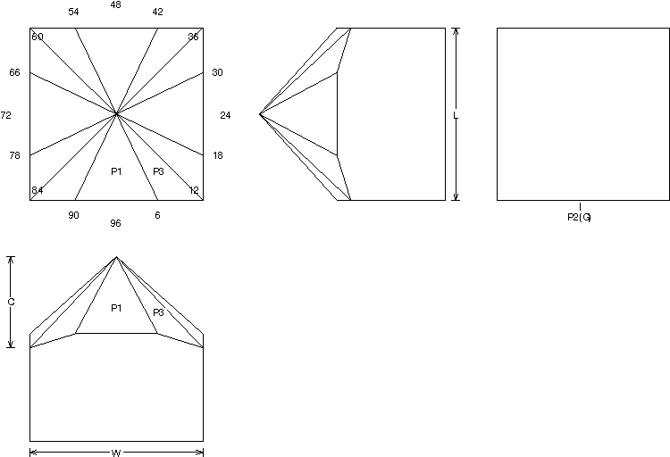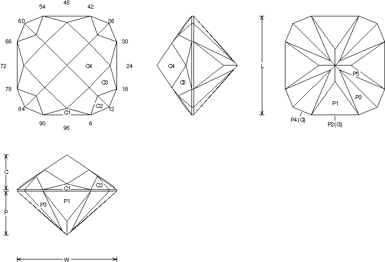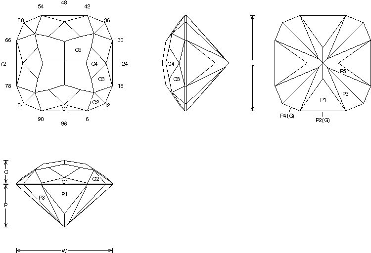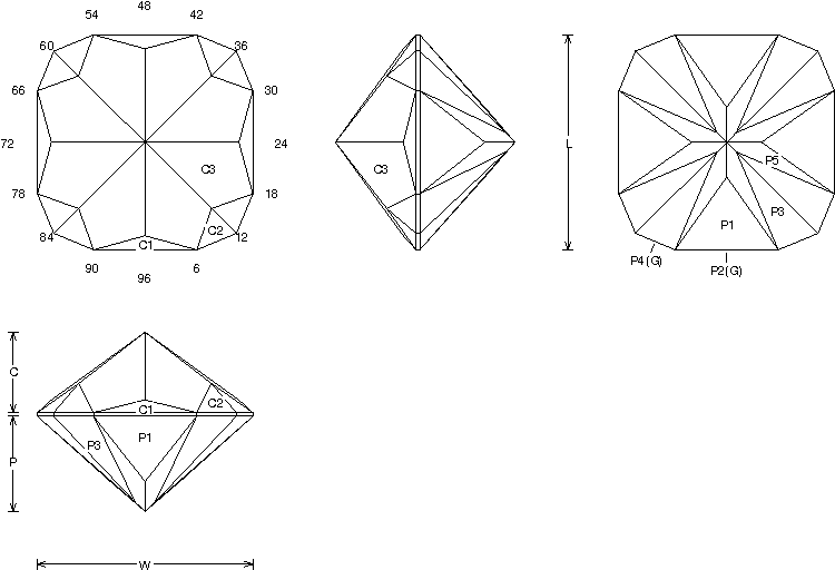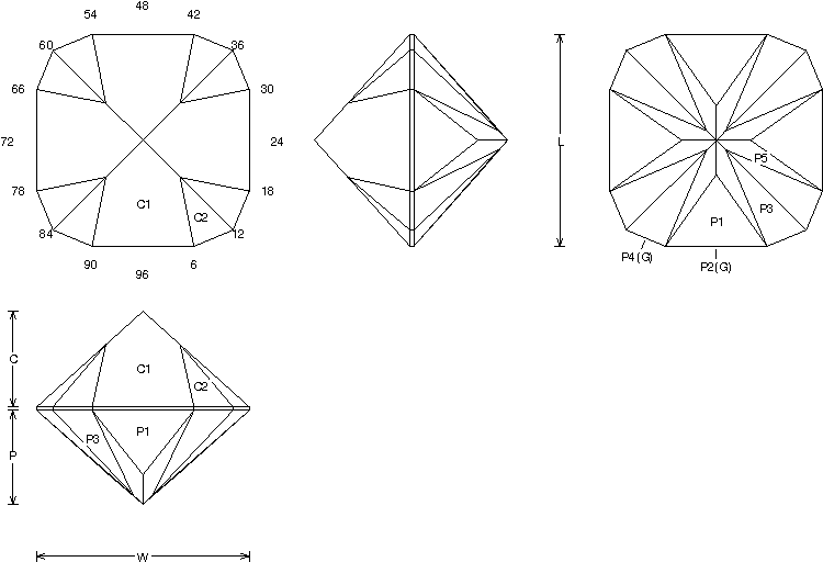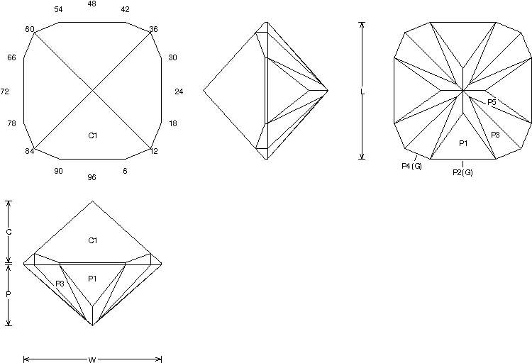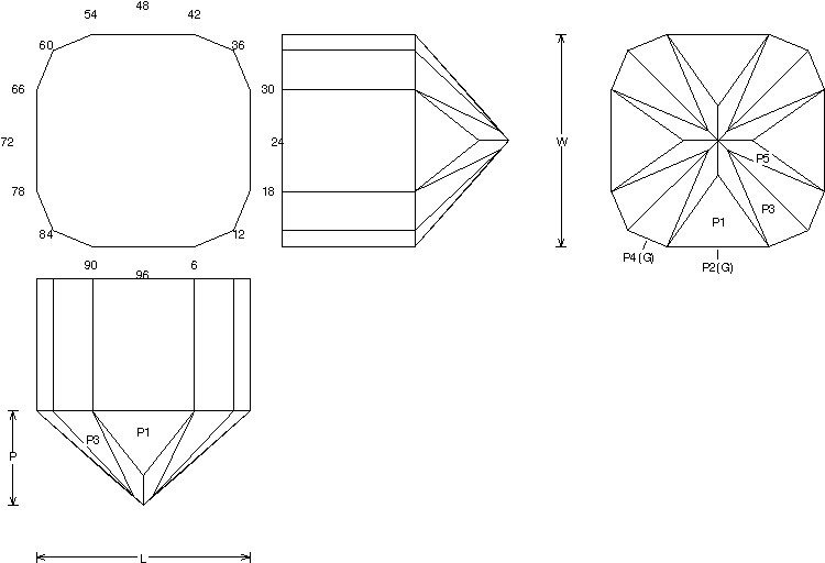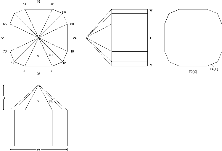 Step #1 (above) First step in cutting this design is to cut P1 to center point. Notice that in the drawing the girdle P2(G) is also cut… It is a good idea to cut the stone to a square if you are a beginner. There are several reasons for cutting to an exact square for a newbie faceter. The main one is that by cutting to a square, the stone will be easier to get straight (make the girdle meets and cheat if needed). The other reason is that if you are not experienced it is difficult to guess how much room to leave at the corners for the P4(G).