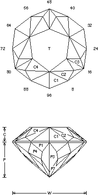 Addition # 3 - This can be hard to follow because of the sym changes. Once you cut one, it's not very hard. This design has a very unusual look to it, I like it in Topaz. Cut in any material, 2-18cts. Cut in refractive indexes 1.62 to 2.14 (84.1) with no changes.
