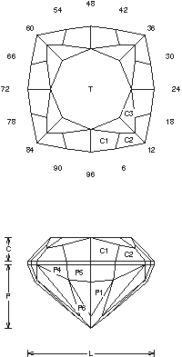 Addition # 5 - This is a "Money Cut"… I have designed this to be simple and adapt- able. The crown can be floated in, notice the lack of meet points. This will help recover weight because of the Barion shape and still be easy and fast. Cut this in light materials because it darkens a bit. Cut P1 to center point, then cut the girdle to meet, then the breaks. This can be cut in R.I. 1.62 to 1.76 (90.2%) with no changes.