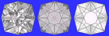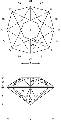 Gram Book 1 - This design is a little more complicated to cut, and works well with dark to medium material, 1-5ct. It's cut a little shallow to help lighten dark material. This is a classic shape and works well in man- made Sapphire and Spinel.