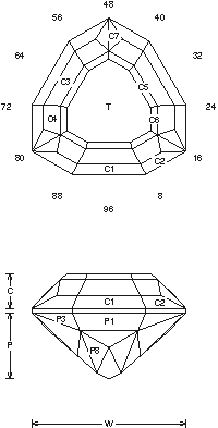 Addition # 1 - The P7 facets meet at the girdle only. It's important to cut them evenly at the correct angle. The steps on the crown can be varied if you want, adjust the C7's. Cut in refractive indexes 1.54 to 1.93 (80.2%) with no changes. This design is fairly hard to cut, 2-12cts.