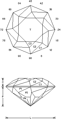 Successful tips, details, and guide on Faceting Designs. Faceting Design Diagram by Jeff R. Graham that presents various cuts, this one is called "P- Eight"
