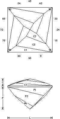 Addition # 2 - Here is a design that cuts fast and makes a great pair of earrings, which is what I designed it for. Cut it in the 4-8mm range in about any material. A preform will help save waste, Quartz is cheap (in lighter colors). I usually don't. On a larger stone a table is a good idea, cut to meet C2, C3. Cut in refractive indexes 1.54 to 1.93 with no changes.