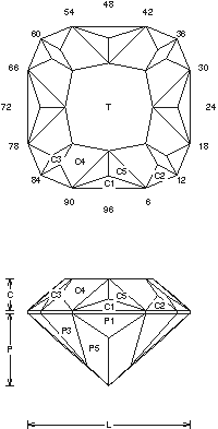 Addition # 3 - This design is a little harder to cut than it looks at first glance. The C5 facets have to be cut exact for the table to work. If your machine has a keyed dop you can cut the table first(then C5), 1-8cts. Cut in refractive indexes 1.56 to 2.14 (84.3%) with no changes.