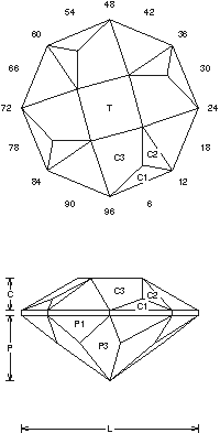 Gram Book 1 - This cut is designed to be fast with good light return and shallow to help lighten up dark Pyrope material. It is a little shallower than "Quickie" for extra dark material, 1/2-6cts. Cut in refractive indexes 1.73 to 2.14 with no changes.