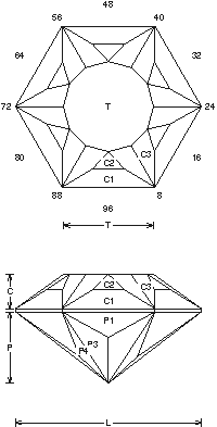 Gram Book 1 - This design is unusual and not hard to cut. The P3 & P4 facets are a different size which gives the stone a very different flash. P4 facets cut very fast so watch out, 1/2-4cts any color med to light material. This design is surprisingly nice, give it a try… Cut in refractive index 1.62 to 1.93 (77.5%) with no changes.