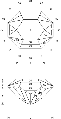 Addition # 2 - Cutting in the table before the C7 facets is easier. A preform is a good idea also. This is medium hard to cut, after you have cut it once it gets easy. Any good material, 1-14cts. Cut in refractive indexes 1.62 to 1.93 with no changes.