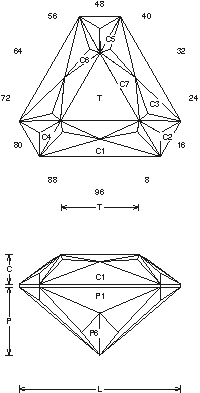 Helpful tips,details and guide on Faceting Designs. Faceting Design Diagram by Jeff R. Graham that presents various cuts, this one is called "t-Tipped Tri".
