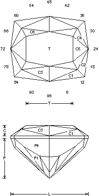 Addition # 5 - Notice when you cut the L/W=1.20 and the P1 tier it will meet at 96-24- 48-72. There are only four girdle facets for speed and yield. This will work in any R.I. from 1.54 to 1.76 (89.8%) with no changes.