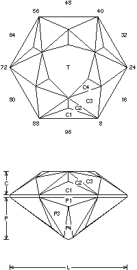 Gram Book 1 - This design is a little harder to cut than it looks like, but it cuts fairly fast and makes a nice 1-4 ct stone in most to light medium material. Cut in refractive index 1.73 to 1.93 with no changes.