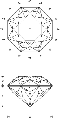 Addition # 1 - This design cuts easy, however it should be a larger stone. Watch the meets on P4 so that the P5, P6 look even, 2-12cts. Cut in refractive indexes 1.62 to 1.93 (90.6%) with no changes. I prefer this in light to medium colored materials.