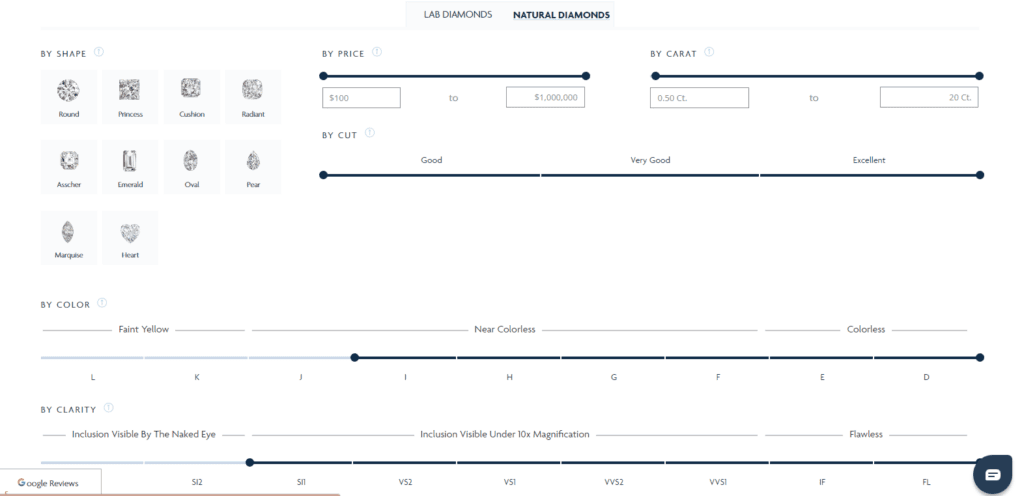 Their diamond search tool is very user-friendly, as well. Every search parameter you choose is marked with clear buttons and most include a brief explanation.