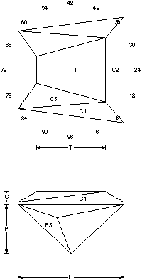 Addition # 7 - This is a design made for accent stones. The best way to cut this is to cut a square girdle first. When I say edge on P4(G), I mean cut to the long edge. The best way to do it is cut until the P4(G)just meets 72 index (cutting the pavilion). This is actually pretty easy and works great for 1.54 to 1.93 with no changes. I like it cut in red Garnet.