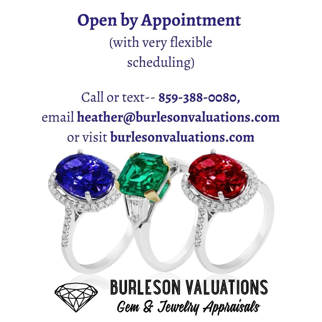Gem and jewelry appraising and consulting firm founded by Heather E Burleson, Graduate Gemologist (GIA), Graduate Jeweler (GIA), and National Association of Jewelry Appraisers Member with more than 22 years of experience. In order to ensure client privacy, this is an appointment-based business. Please call, text, email, or visit the website to secure an appointment, explore available services or pose any questions regarding jewelry or appraisals.