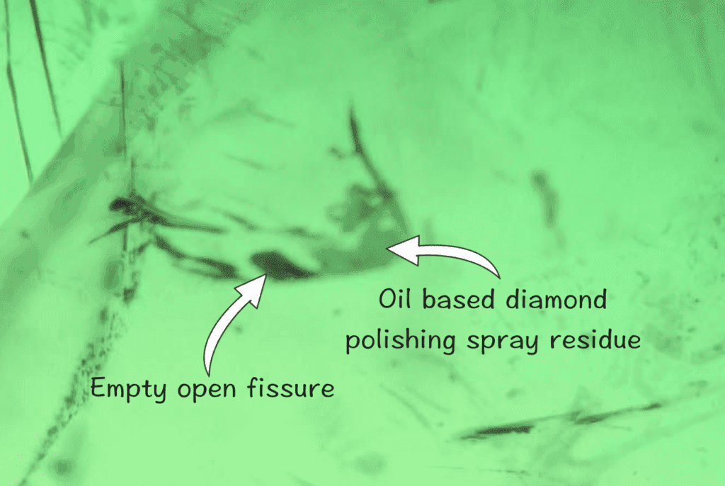 - Emeralds with no fissures (very rare): as there are no fissures at the time of testing, these emeralds cannot and are not clarity enhanced by a fissure filler at the time of testing. In such a case, we will state on our report: no indications of clarity modification at the time of testing.
