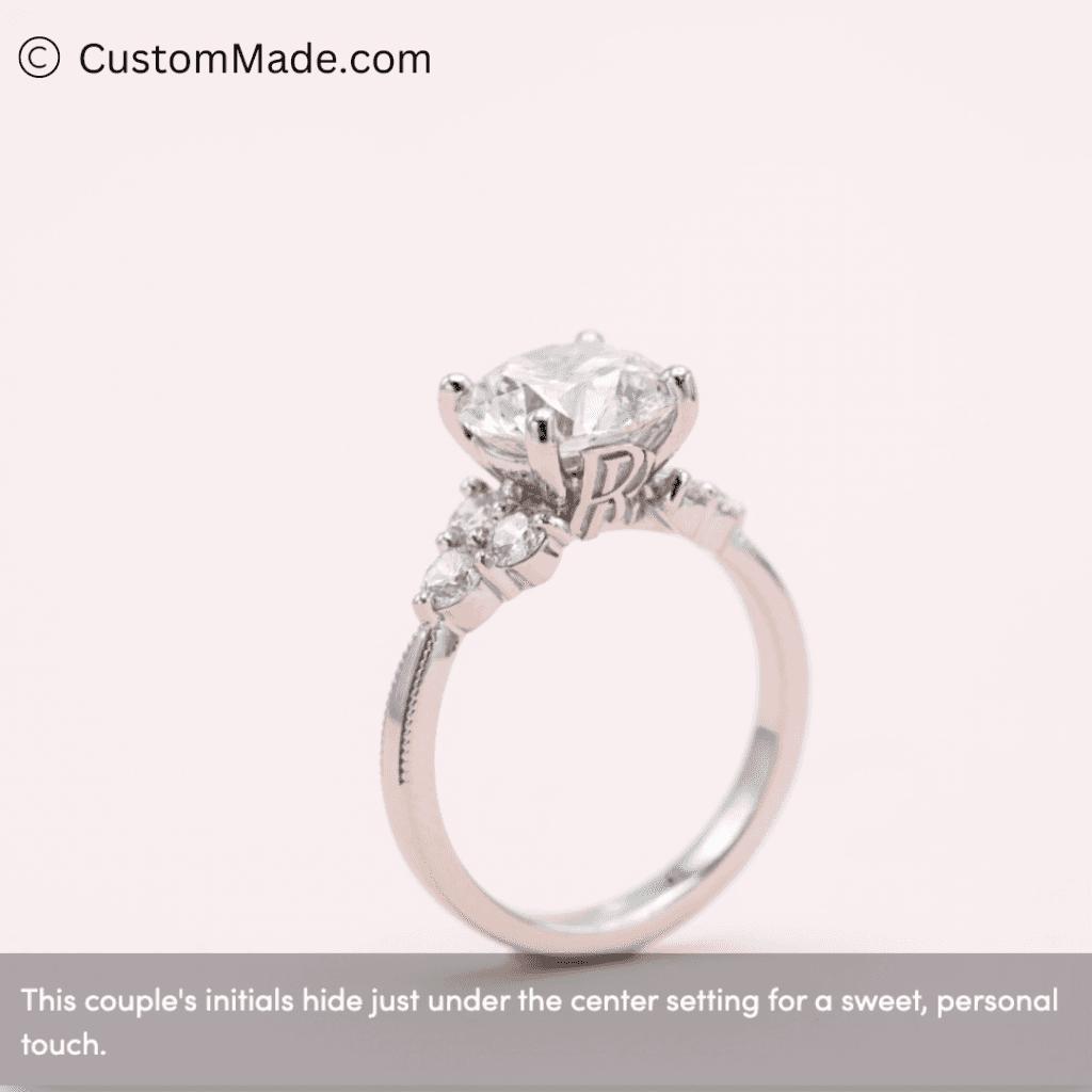 This ring has the same round brilliant center stone and clustered accent stone design as the previous ring. Notice, too, the milgrain detail on the shoulders. But this ring has at least one "R" emblazoned on the undergallery - possibly two "R's" (it's hard to see) because the caption says it's the couple's initials.